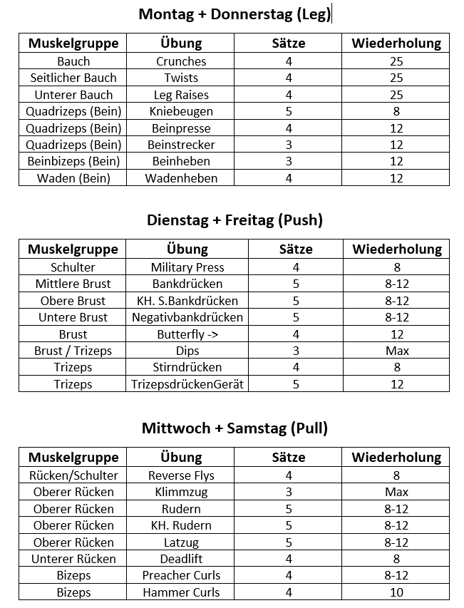 Der schlimme Teil kam dann erst, denn ich musste mir einen eigenen Trainingsplan erstellen… Das führte dazu, dass ich mir mehrere Videos auf Youtube angeschaut habe und mich genrell im Internet erkundigt habe. Irgendwann habe ich verschiedene Arten von Trainingsplänen gefunden. Zum einem gibt es den „Ganzkörperplan“ Trainingsplan oder auch den „Push, Pull und Leg“ Trainingsplan. Dann habe ich irgendwann eine Internetseite gefunden, welche jede Übung zu jedem Muskel anzeigt, aus dieser Seite habe ich mir dann einen „Push, Pull und Leg“ Trainingsplan erstellt, welchen ich Montags bis Samstags machen werde.